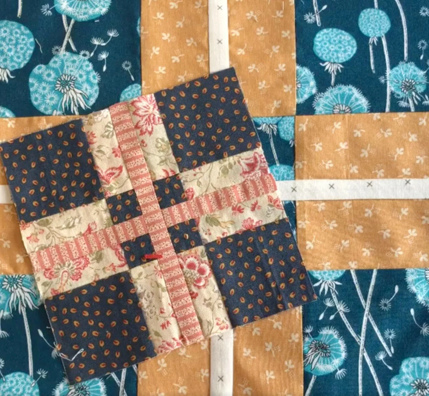 I’m sure this block has come about by someone accidentally slicing through their nine patch block. How annoying that would be but sew a strip through the middle and there you have it - a new block. Fantastic.